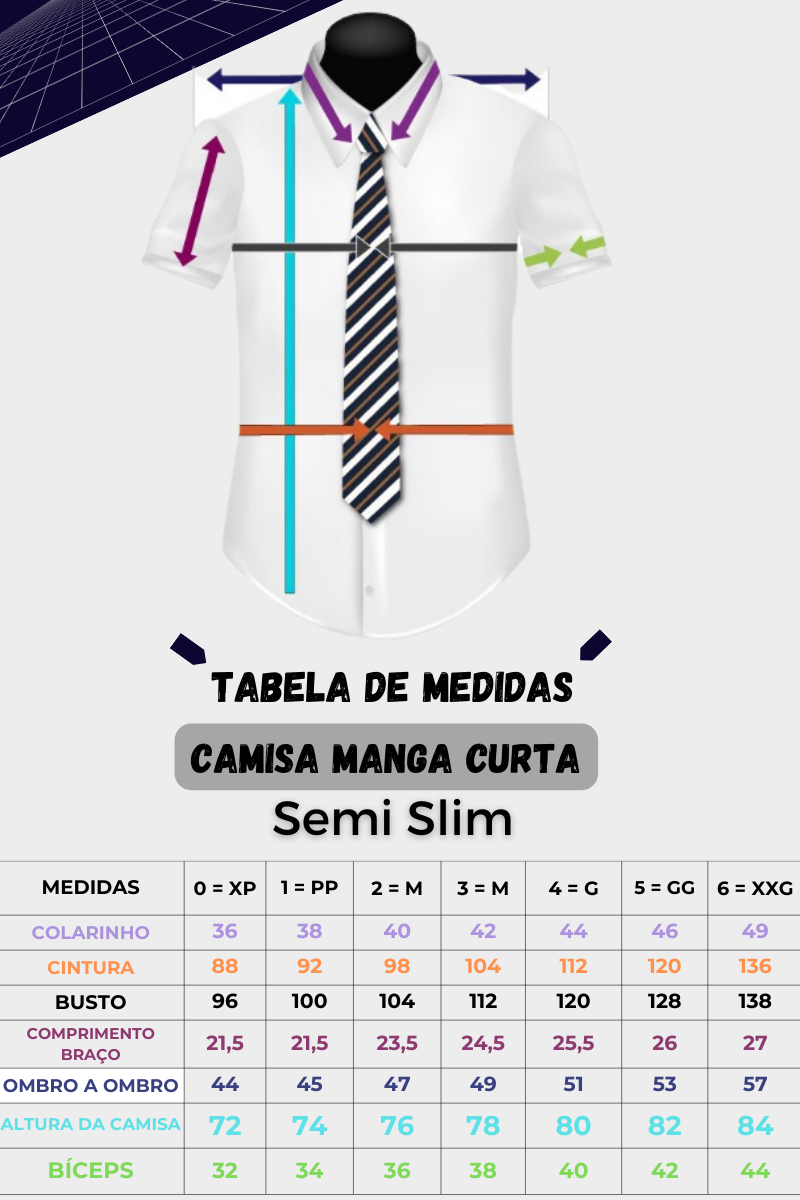 Camisa: Manga curta. Gola: Francesa/rígida e estendida. Modelagem: Semi Slim. Tecido: 70% Algodão /30% Passa fácil Marca: Ms Stilos. Cor: Branca lisa. Modelo: Semi Slim. Bolso Frontal: Não. Prega: Não. Duas pensas laterais: Para um […]