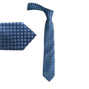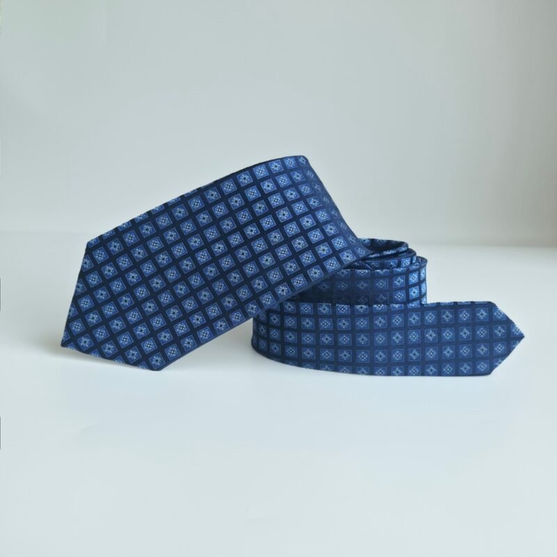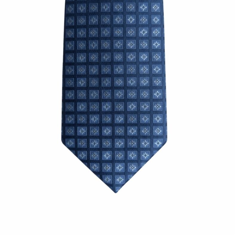 Na cor azul marinho com micro estampa geométrica em tons de azul claro, apresenta um desenho sofisticado e bem distribuído, ideal para composições formais, ambiente corporativo e ocasiões que exigem presença equilibrada.