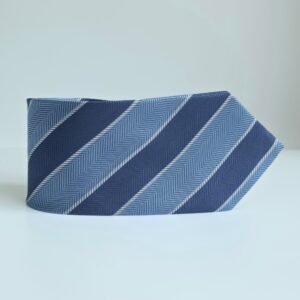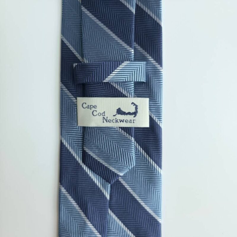 A gravata Cape Cod Neckwear em seda apresenta um elegante padrão listrado em tons de azul médio, azul claro e branco, criando um visual clássico e versátil.