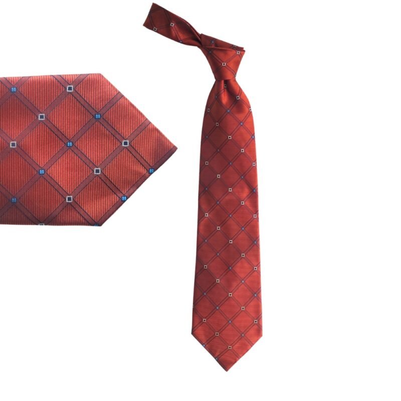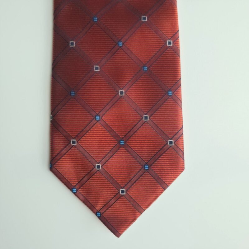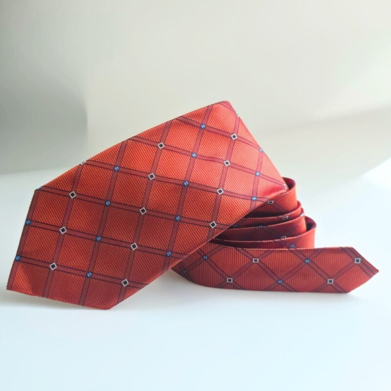 Sua tonalidade laranja terracota com padronagem geométrica em azul e detalhes em branco cria um contraste moderno e refinado. O diferencial está na sua construção: trata-se de uma gravata larga, densa e com elevada gramatura, proporcionando uma estrutura firme e acabamento marcante.