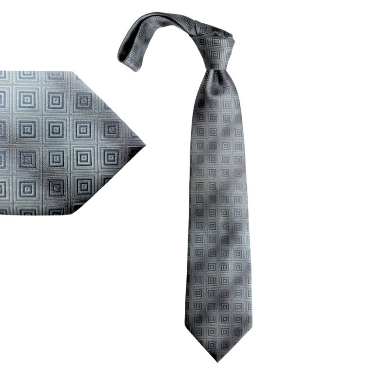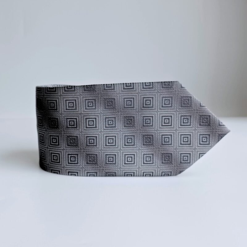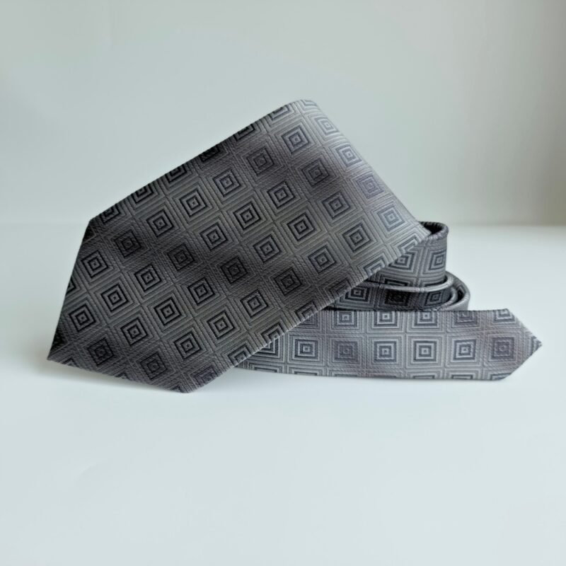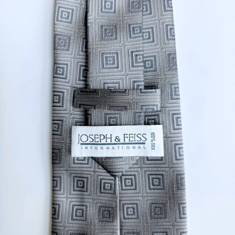 A gravata Joseph & Feiss International 100% Silk na sofisticada tonalidade prata com desenho geométrico em cinza traduz elegância clássica com presença marcante.