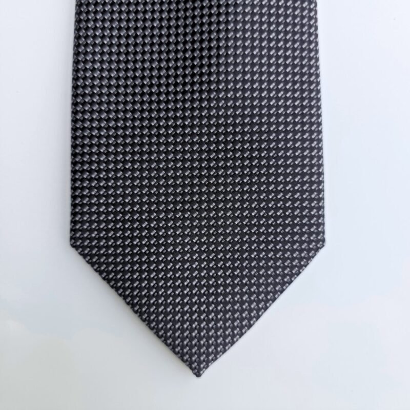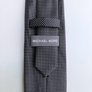 A gravata Michael Kors em chumbo escuro com micro detalhes em preto é uma peça de elegância madura e imponente. O contraste sutil entre o chumbo predominante e o fundo preto cria um efeito sofisticado, com textura rica e visual refinado.