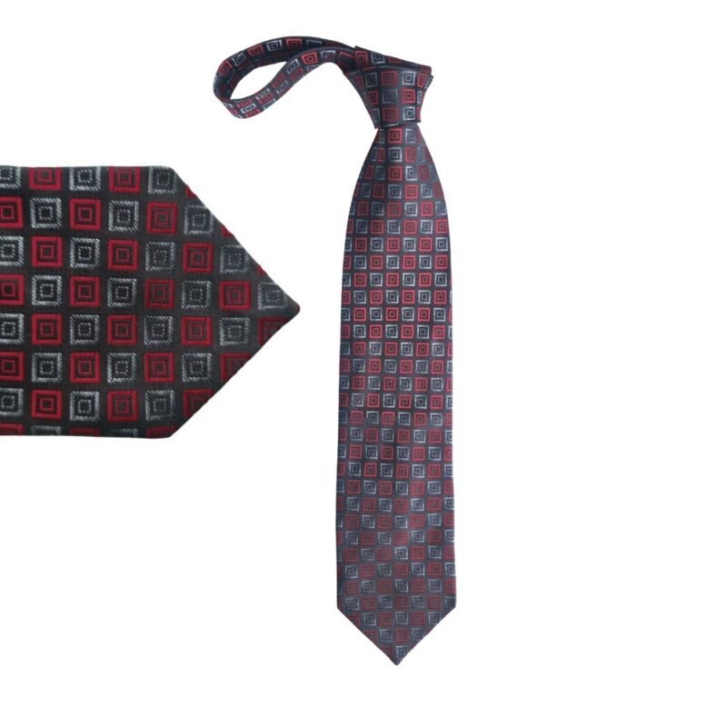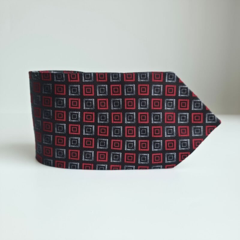 Seu padrão geométrico em vermelho, grafite e preto cria contraste refinado e transmite autoridade. É uma gravata que se destaca sem exageros — forte, elegante e segura.