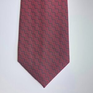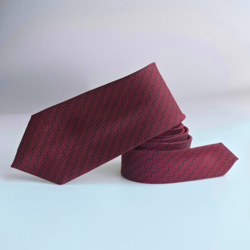 Gravata semi-slim em tom vermelho com padronagem geométrica em preto.
