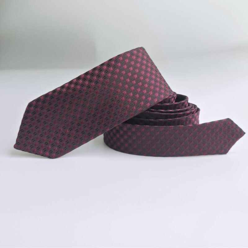 Gravata Slim Fit em tom bordô com padronagem geométrica discreta, criando profundidade e sofisticação dentro da própria tonalidade.