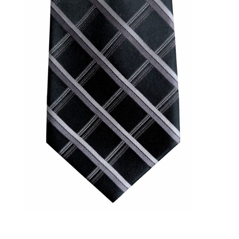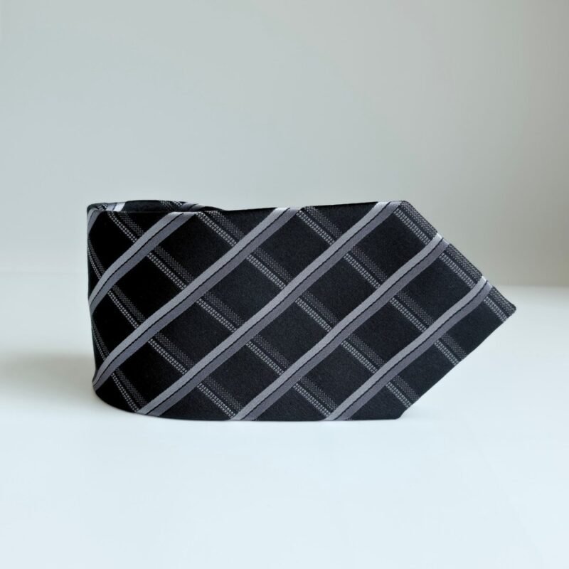 Em tonalidade preta com listras diagonais em prata e grafite, essa peça transmite sobriedade, autoridade e refinamento. A padronagem diagonal alonga visualmente o traje, tornando-a perfeita para ambientes formais, reuniões executivas e ocasiões que exigem postura e distinção.